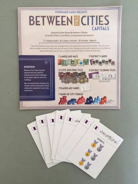 Between Two Cities: Capitals expands the base game by adding several new challenges: landscapes, districts, and civic building tiles. This is not a standalone expansion; you need the original Between Two Cities game to play. In more detail: