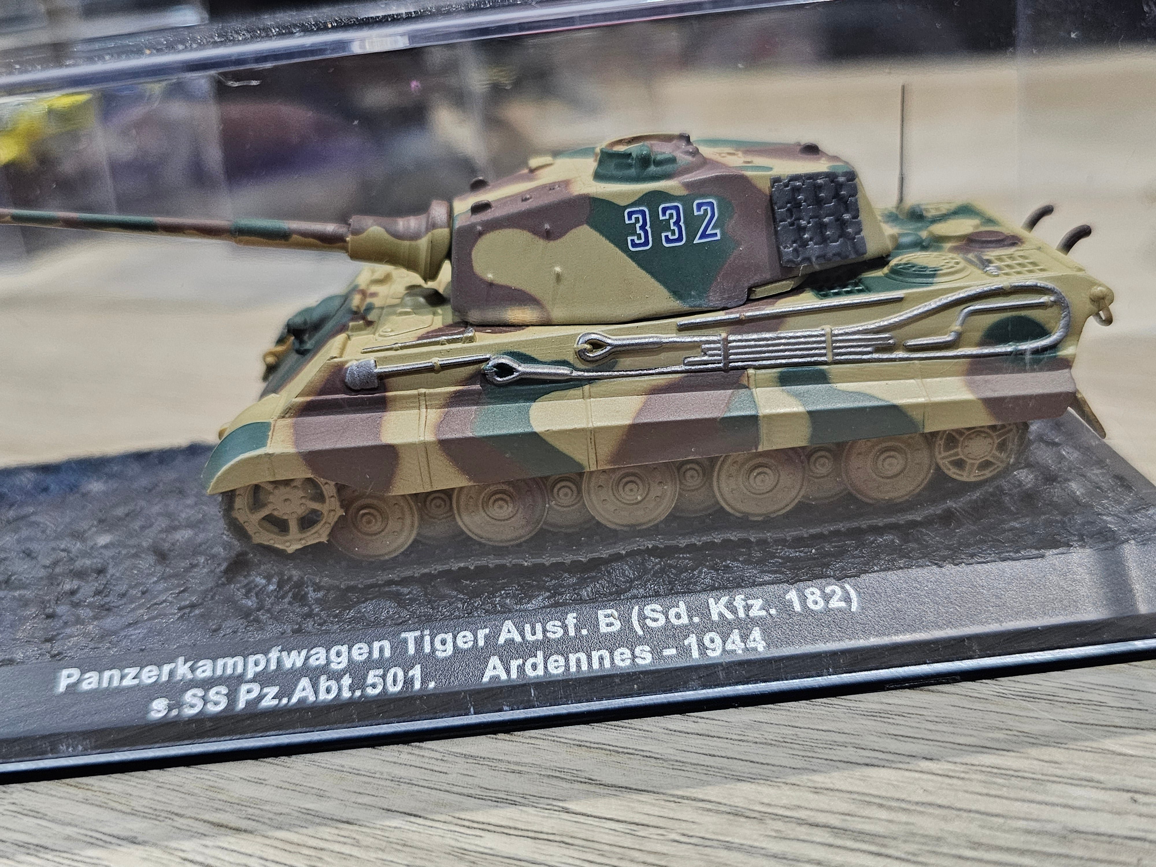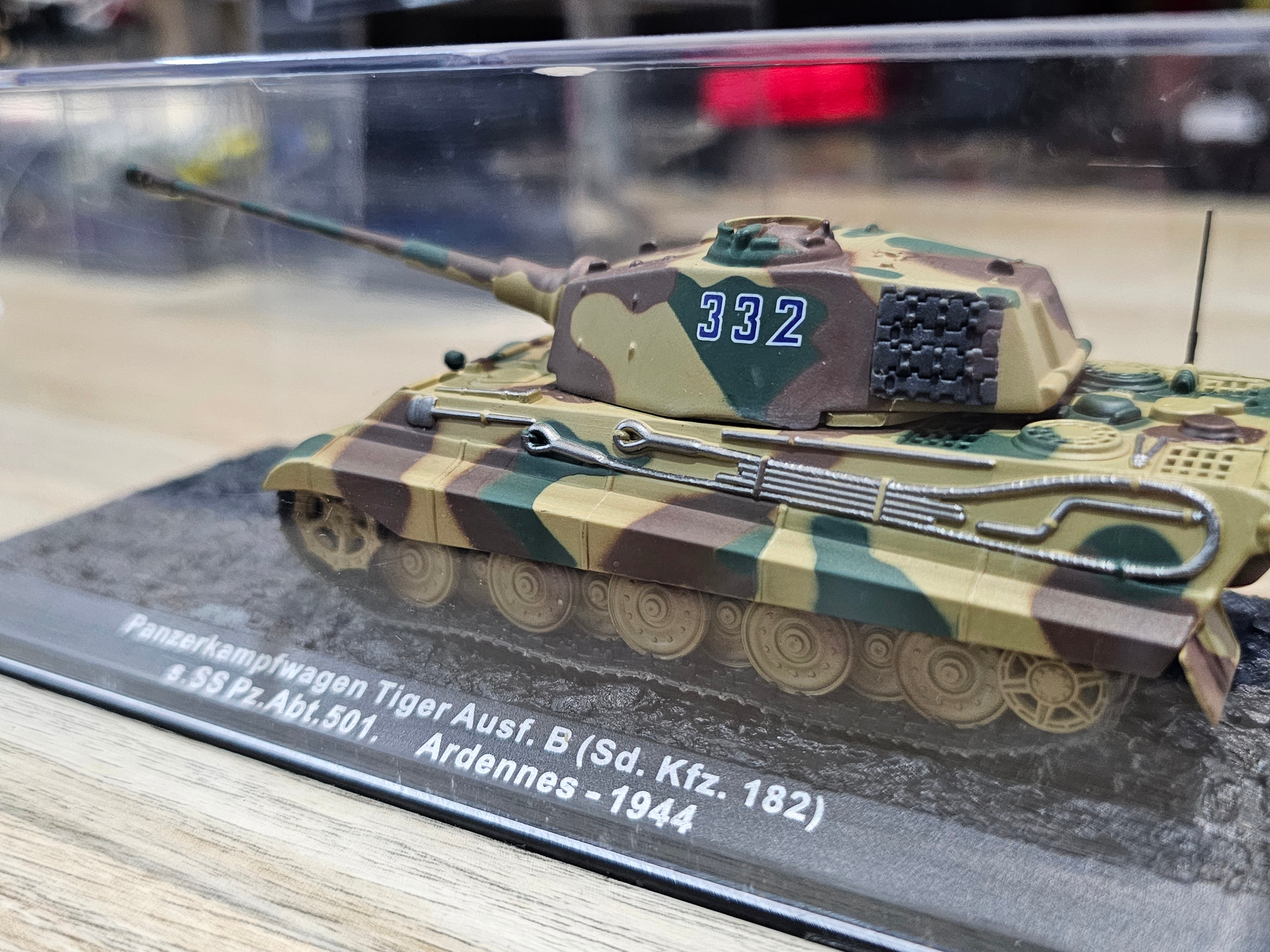 The 1/72 scale diecast model of the Pz.Kpfw. VI Tiger II Ausf.B, representing the tank used during the Battle of the Bulge in the Ardennes in 1944, is a prized item for military model collectors. Here are the details and features of this model: