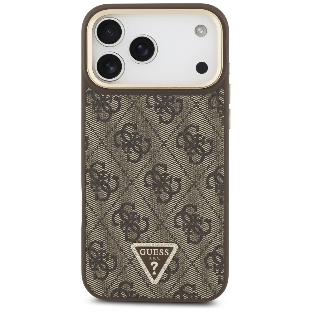 Guess PU Leather 4G Strass Triangle Logo Gold Frame MagSafe Case for iPhone 17 Pro Max Brown