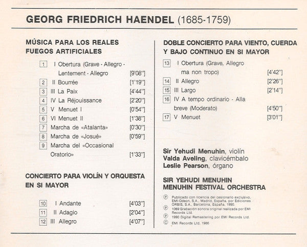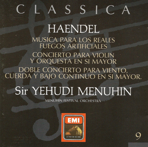 CD - Haendel* - Sir Yehudi Menuhin*, Menuhin Festival Orchestra – Música Para los Reales Fuegos · Concierto Para Violín Y Orquesta En Si Mayor · Doble Concierto Para Viento, Cuerda Y Bajo Continuo En Si Mayor - USADO