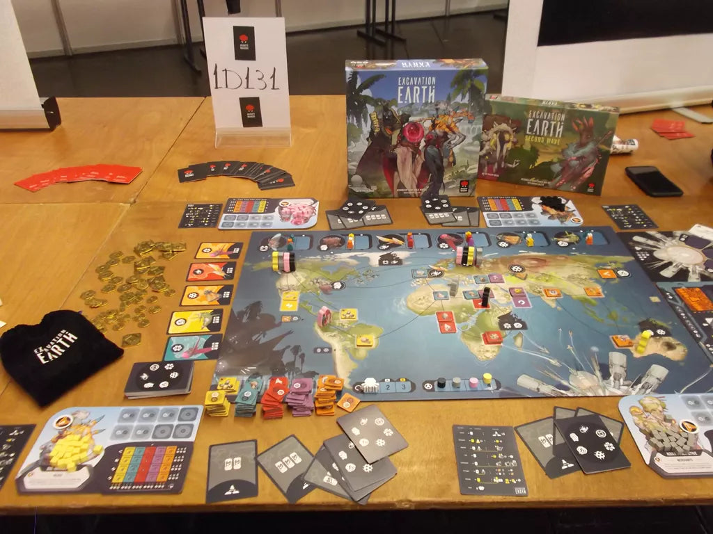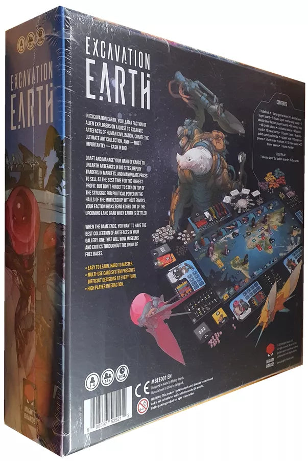 The artifacts you dig up can be either sold to the bazaars housed on one of the aliens' ships that landed on Earth or added to a collection that will be sold off as a coherent art collection to museums back home. Excavation Earth ends after three rounds and the player who makes the most money during the game wins.