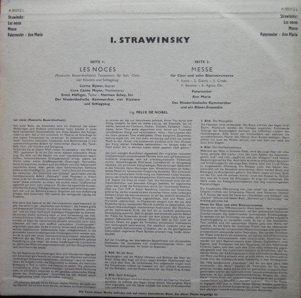 LP VINYL - Strawinsky*, Felix De Nobel Ltg. Der Niederländische Kammerchor* – "Les Noces" / Messe / Pater Noster / Ave Maria - Holland Festival 1954 - USADO