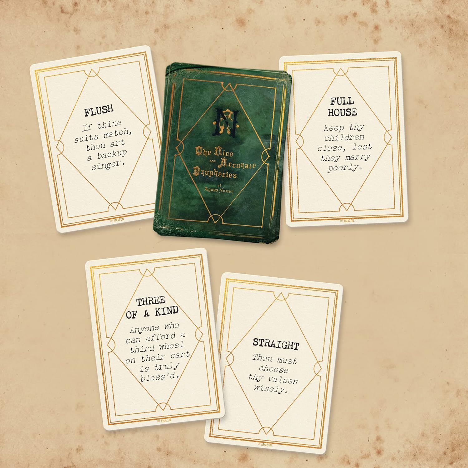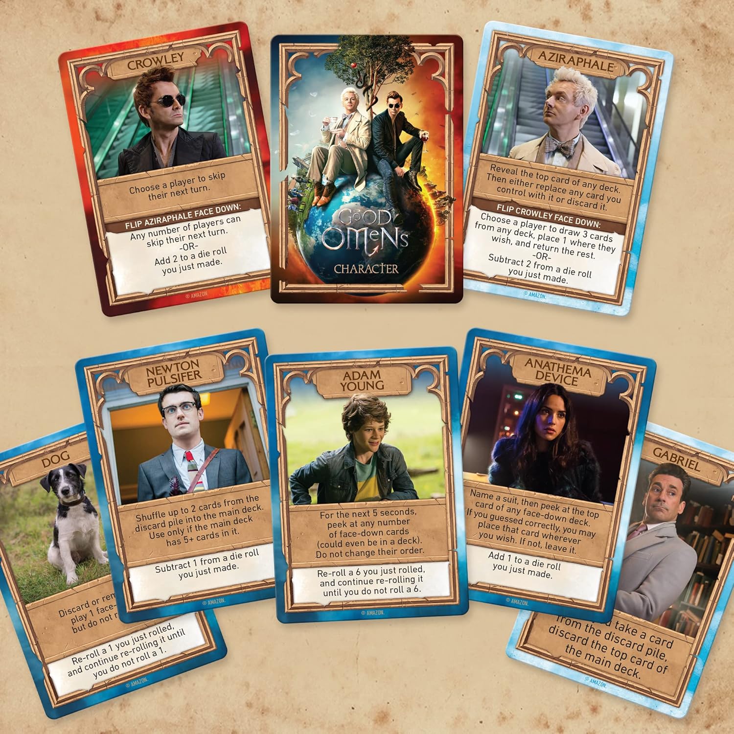 In this game, you will find several different dice and card games themed around the confrontations that took place in the final chapter (for now) of the Good Omens story. Many of the games feature a mix of dice and cards. Why cards? Because cards feature in the series and in the ethos of Good Omens. This whole existence thing is like one big game to those who pull the string.