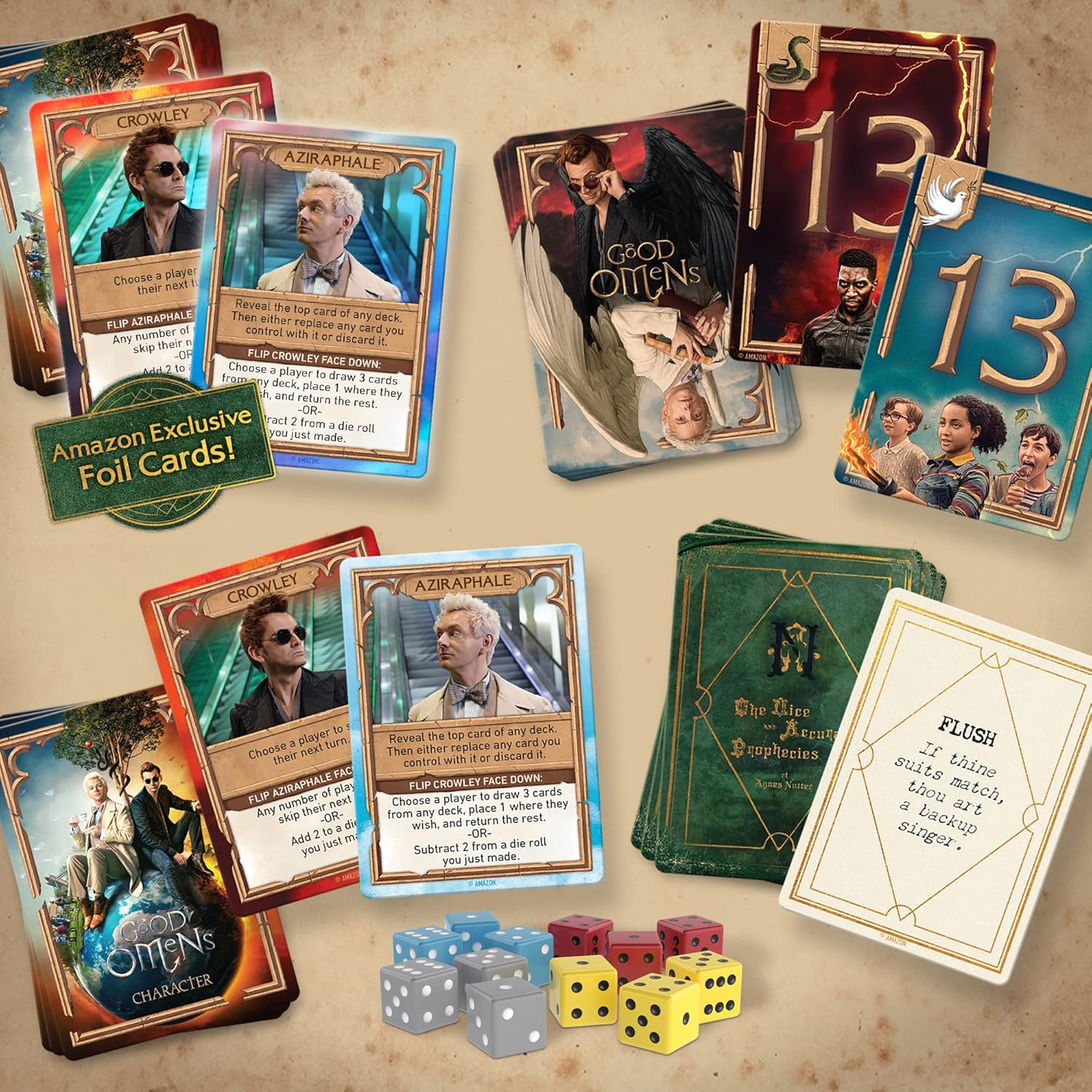 7 different co-op dice and card games based on the confrontations in Good Omens.