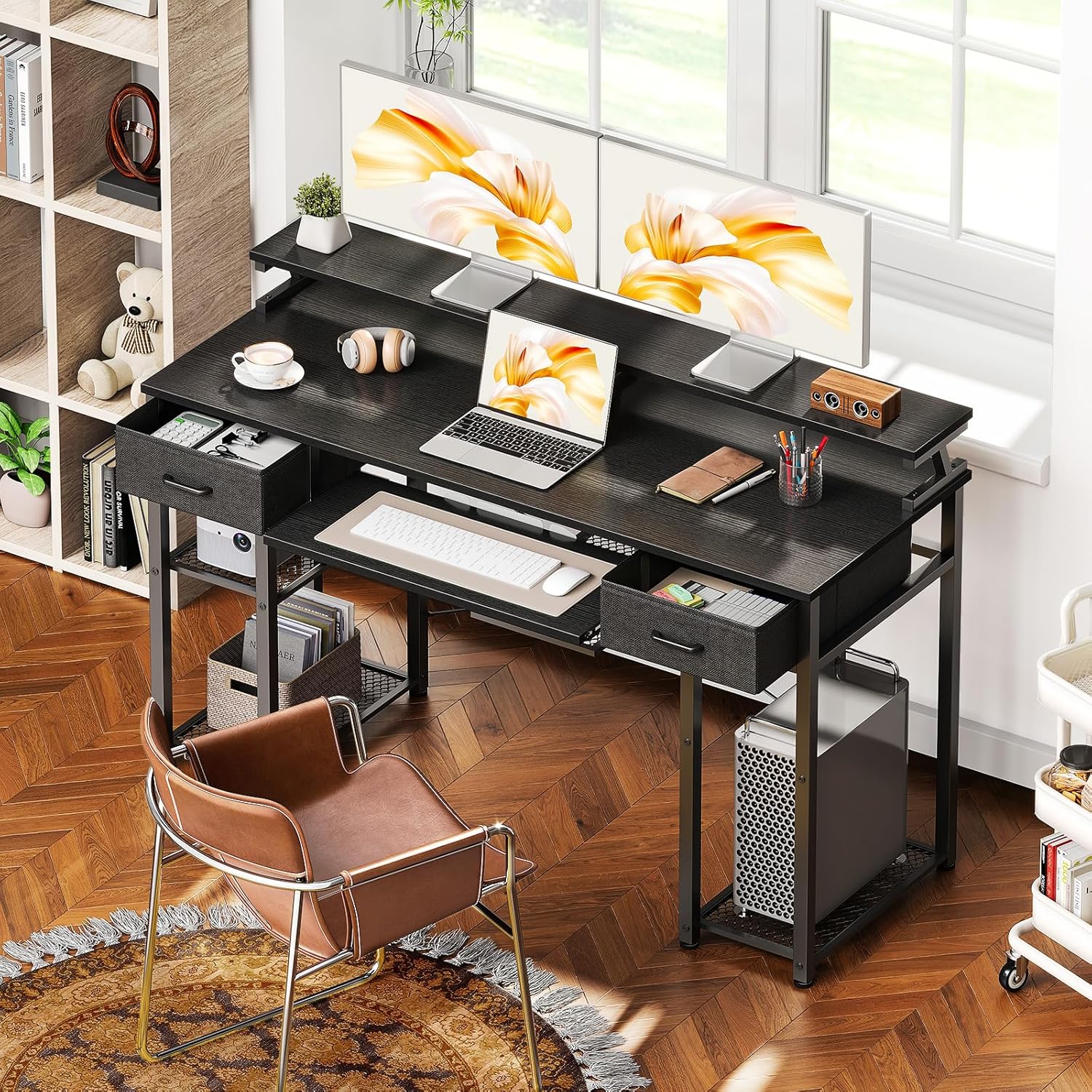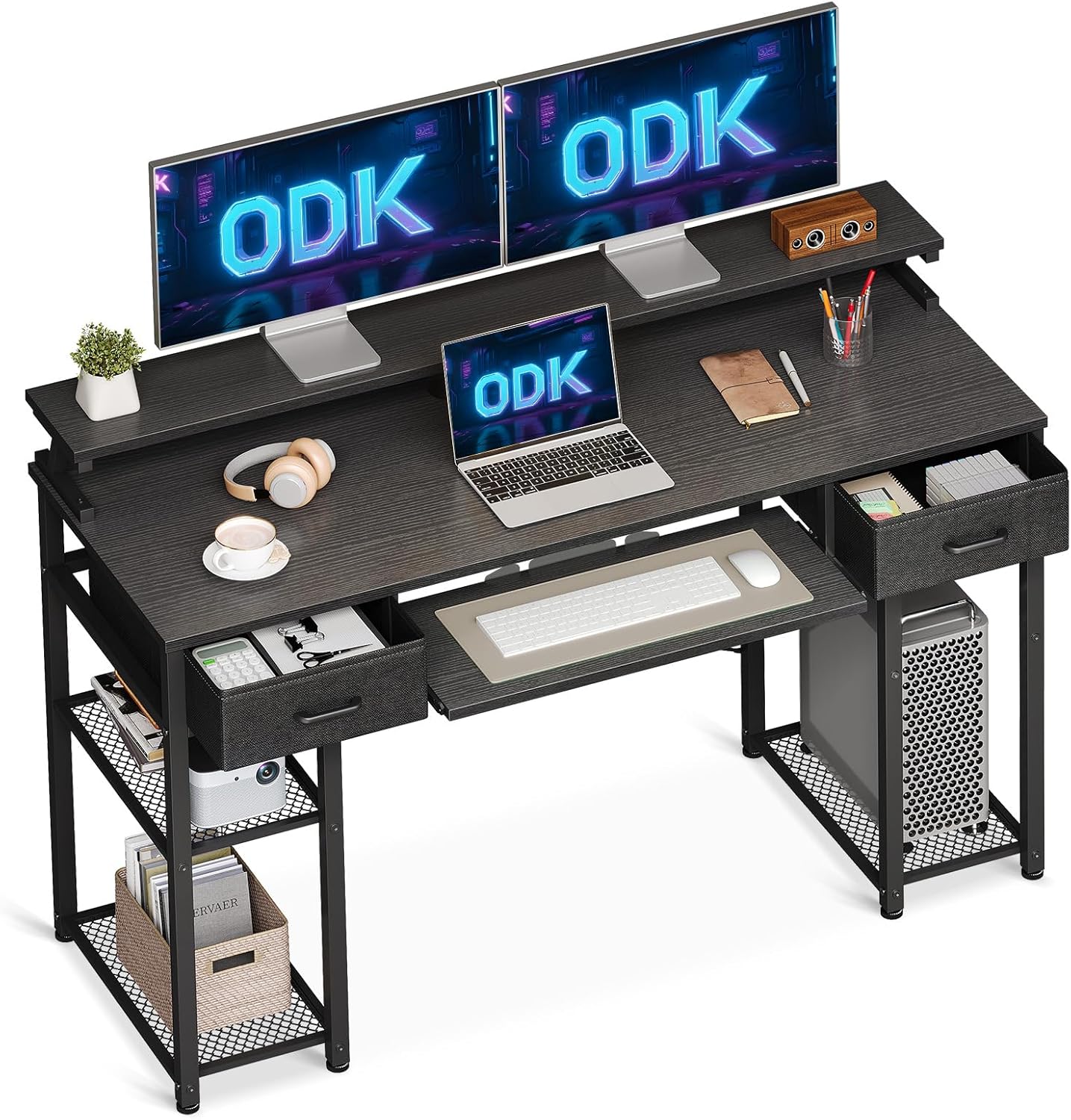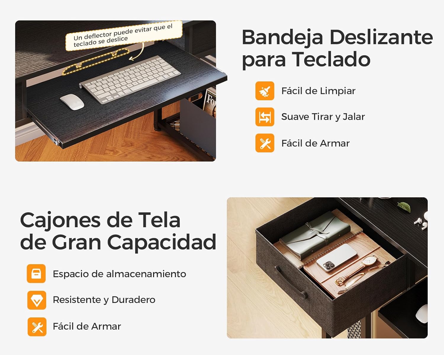 - Escritório de computador com bandeja de teclado e gavetas: a bandeja de teclado removível com deslizadores de metal para garantir um deslizamento suave, adequado para teclado e rato e proporciona uma melhor experiência de jogo e trabalho. A mesa do escritório é com 2 gavetas ao lado, o que é perfeito para armazenar os seus livros, material de escritório ou equipamento de jogo, tornando o seu espaço mais organizado.