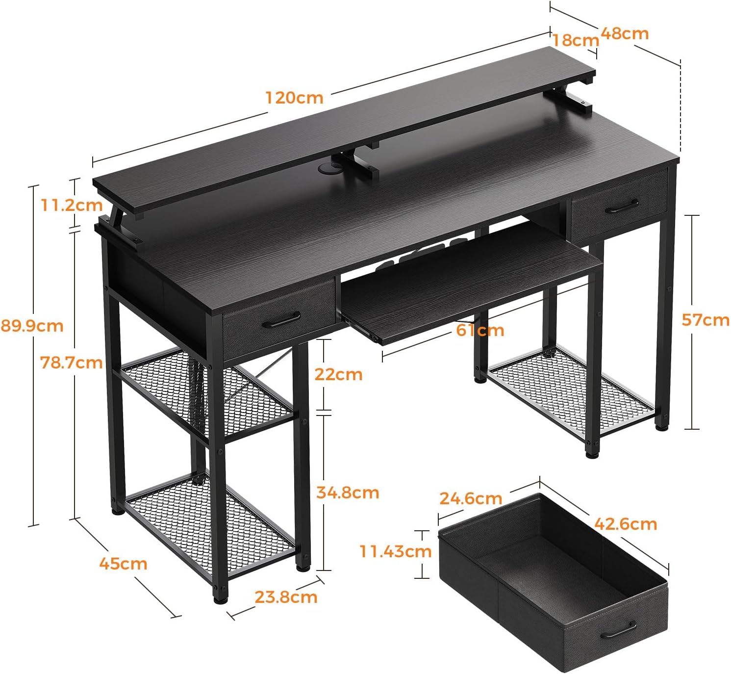 - Escritório com suporte para monitor: a secretária com suporte para monitor oferece um ângulo confortável na sua linha de visão para evitar dores no pescoço e nas costas. O design longo pode conter 2 monitores e outros acessórios. Além disso, o espaço sob o suporte do monitor aumenta o espaço de armazenamento, o que é perfeito para colocar os seus livros, canetas e outros artigos.