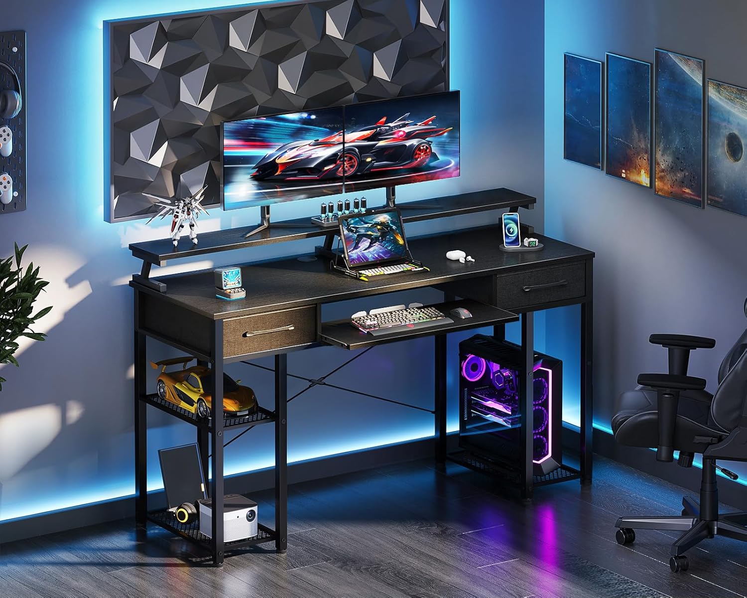 - Mesa de jogos com suporte de CPU e prateleiras: a mesa com espaço de armazenamento está equipada com um suporte de CPU e prateleiras abertas que proporcionam muito espaço de armazenamento. A prateleira do meio é removível, pode ser uma estante de 2 níveis ou um suporte de CPU. Dependendo da sua preferência, pode colocar a prateleira no lado esquerdo ou direito.