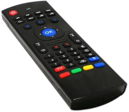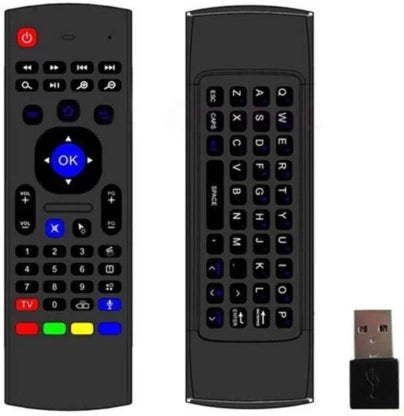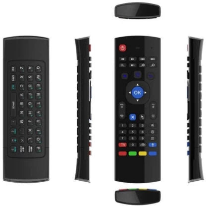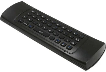 Comando remoto sem fios 2 em 1 que combina controlo multimédia frontal com mini teclado QWERTY completo na parte traseira, permitindo uma navegação muito mais rápida e confortável em televisões inteligentes, TV Box ou computadores ligados à TV.