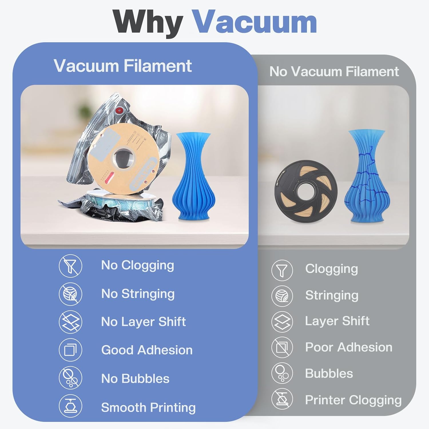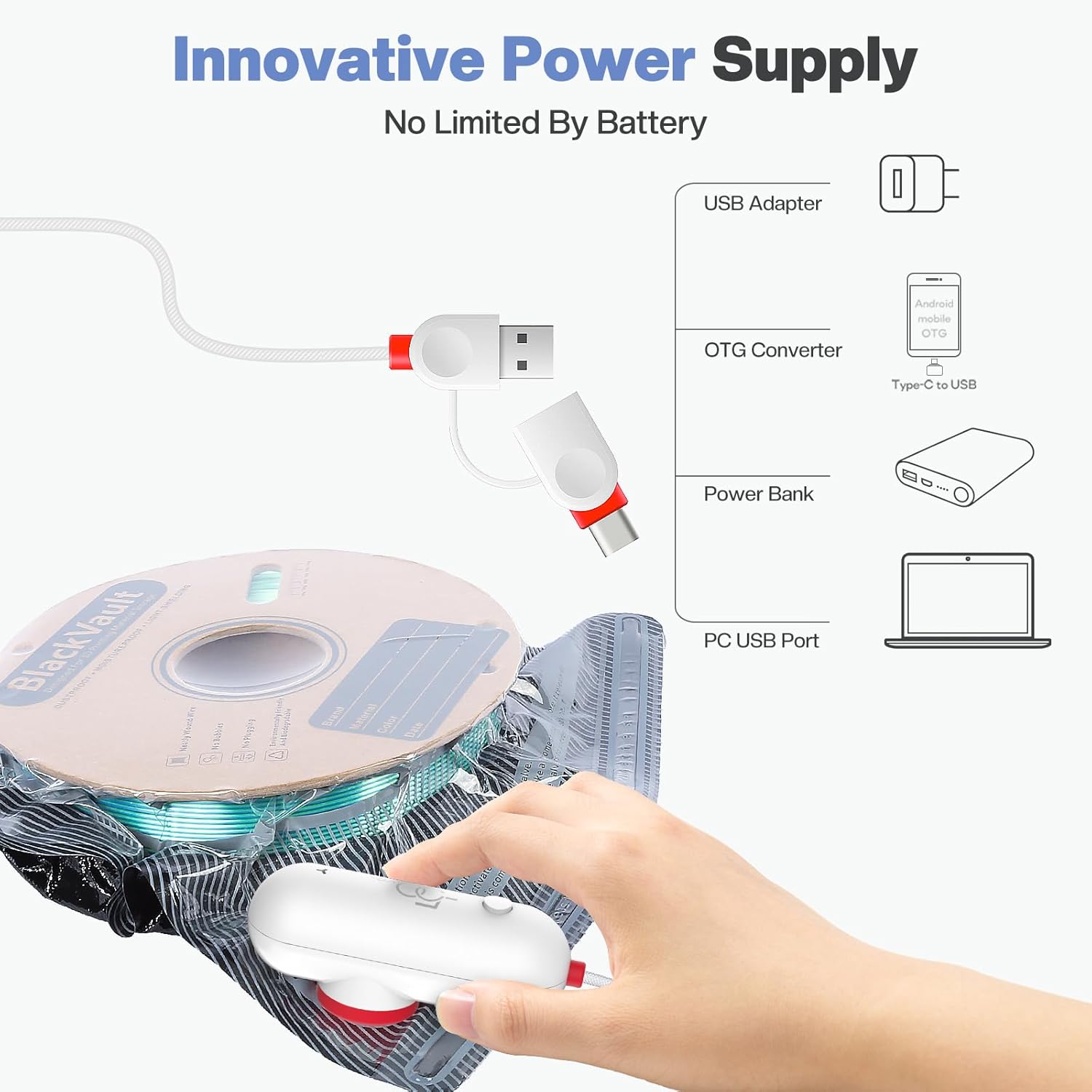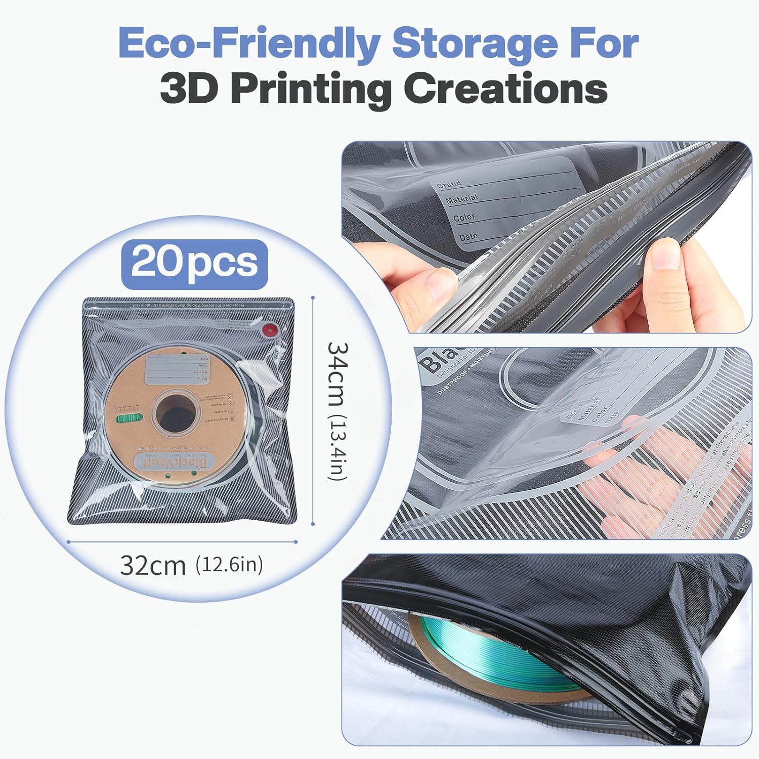 Com a bomba elétrica USB incluída, remover o ar é rápido e simples, permitindo selar cada saco em poucos segundos e prolongar significativamente a vida útil dos teus filamentos.