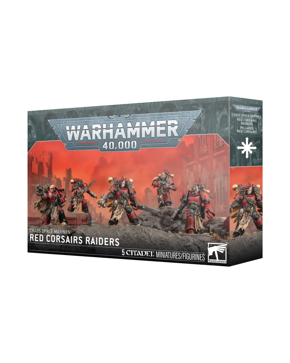 The Red Corsair Raiders are a whole new plastic kit, and show off a different side of the Chaos coin than we usually see, with nary a daemon or mutation in sight. They represent Space Marines that have turned against the Imperium without the aid of the Dark Gods, and sport an eclectic mix of wargear compiled from old armour marks and modern Imperial patterns of weapon.