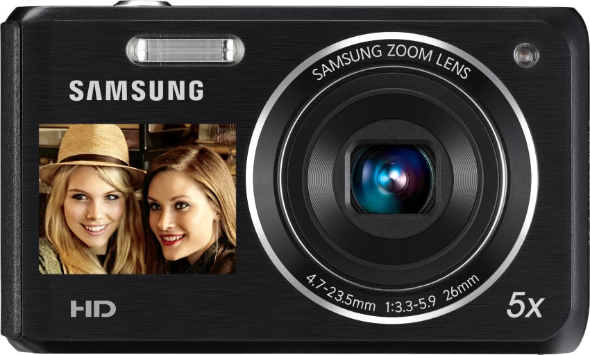 the Samsung DV100 is a compact digital camera known for its unique dual-screen feature, which includes a front-facing LCD screen in addition to the main rear display. Here are some key features and specifications of the Samsung DV100: