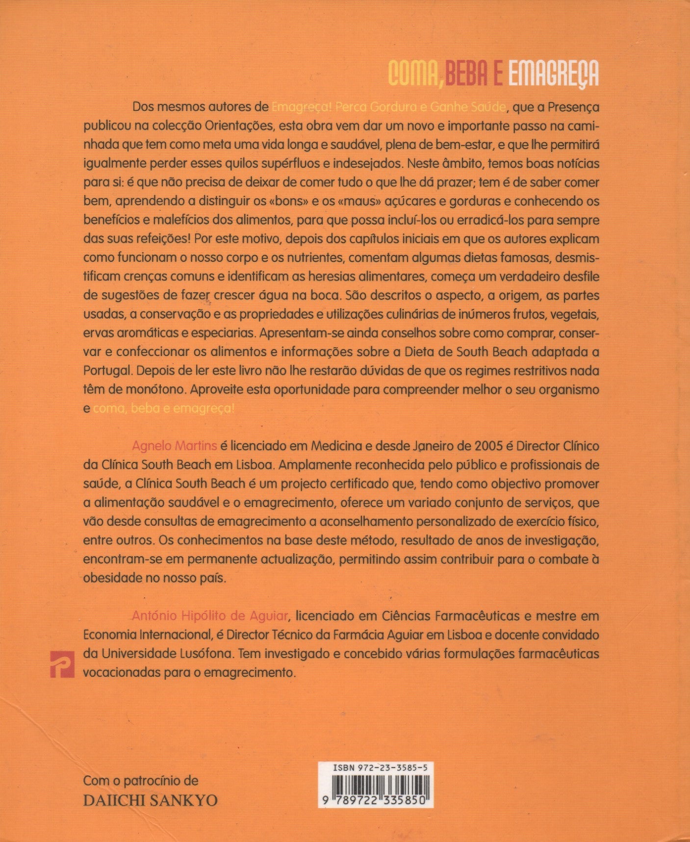 Com prefácio de Fernando Bernardo, Professor associado da Faculdade de Veterinária da Universidade de Lisboa, esta obra apresenta metodologias eficazes para o controlo no excesso de peso. São abordados regimes dietéticos e de emagrecimento, selecção criteriosa de alimentos como os frutos e os vegetais, ervas aromáticas e especiarias e indicadas pistas para saber comprar, conservar e confeccionar os alimentos, de modo a que o leitor possa compreender o funcionamento do seu organismo e travar uma luta em favor da perda de gordura. Conhecer os nutrientes e saber distinguir os bons dos maus, é o ponto de partida para emagrecer de uma forma racional e equilibrada, sem cometer sacrifícios ou dietas radicais que descompensam o corpo, e a médio, longo prazo poderão trazer complicações irreversíveis e resultados pouco eficazes. Comer e beber com consciência e conhecimento prévio dos benefícios e malefícios que cada produto representa, conduzirá ao objectivo final: emagrecer com saúde. Fique ainda a conhecer a célebre dieta de South Beach adaptada à realidade portuguesa.