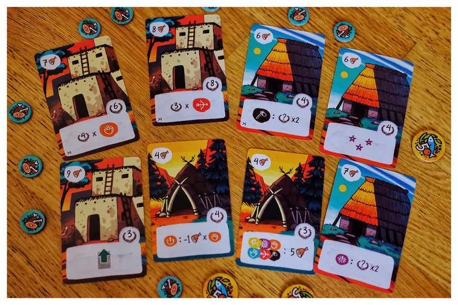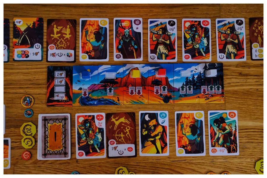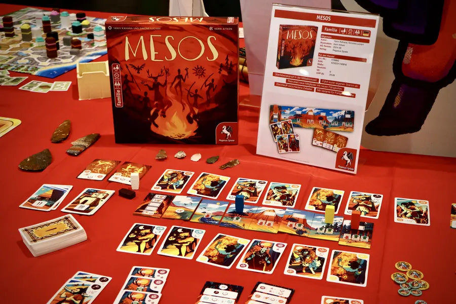 In MESOS, you are the leader of an ancient tribe, and as such, your role is to nurture the growth of your tribe by adding new members, ensuring its sustenance, constructing buildings, and addressing unfolding events. Each round, you must place your totem pawn on the offer track, then following the pawns' order on the track, you will acquire character or building cards and add them to your tribe. Each card has specific effects and may earn prestige points (PP) as you construct specialized buildings and prepare wisely for the events you will face.