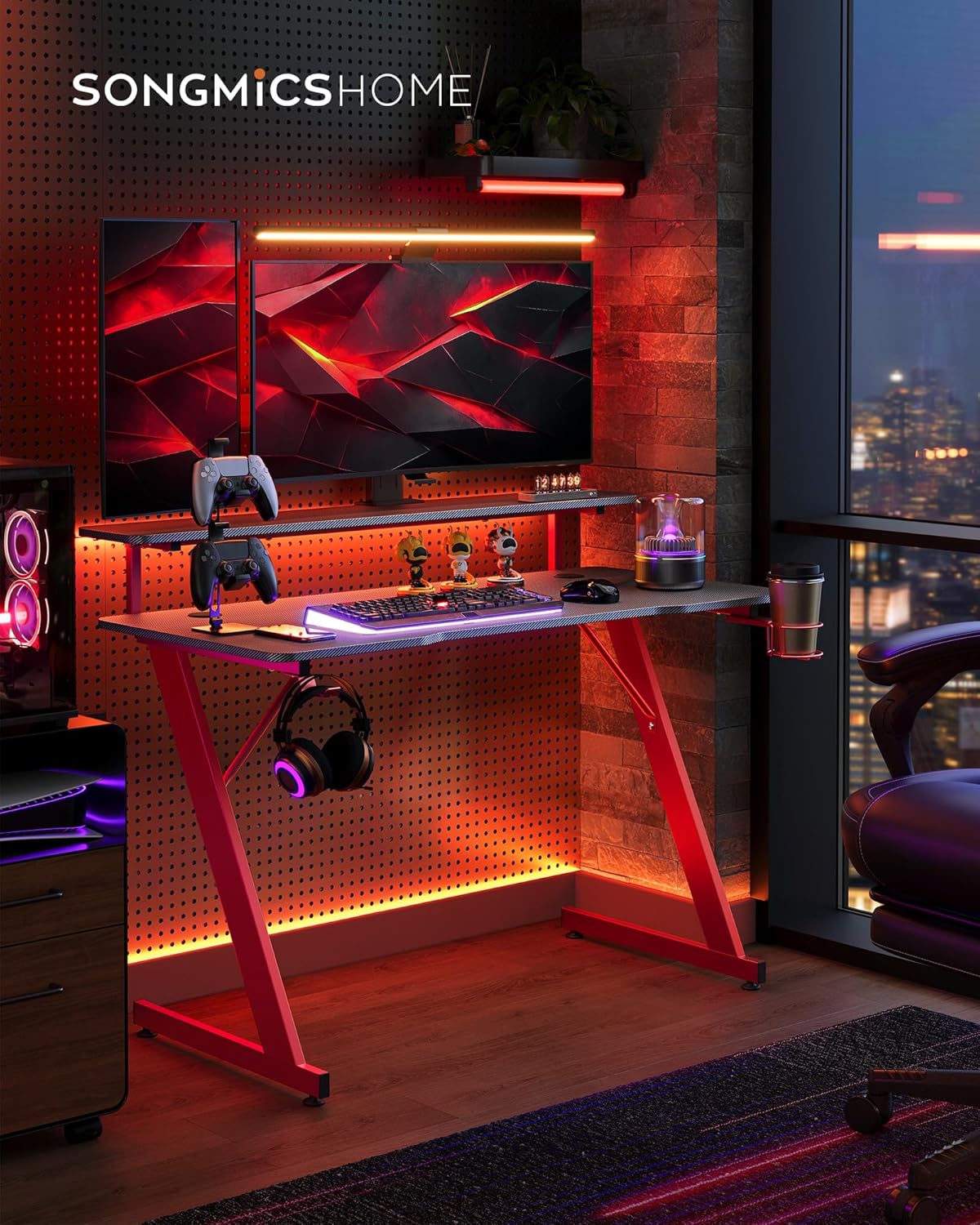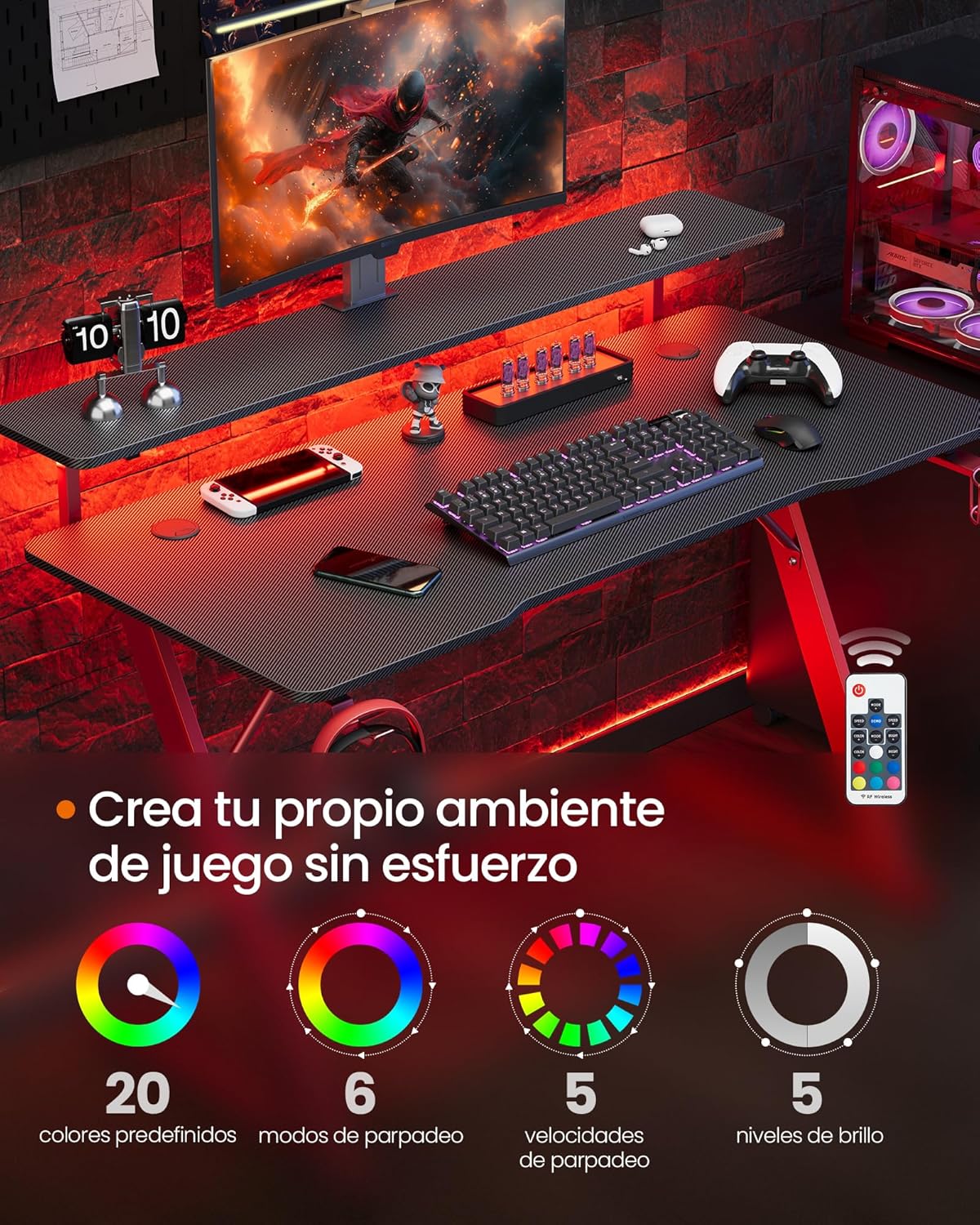 - Iluminação LED integrada: esta mesa de computador possui iluminação LED integrada com 20 cores, 6 modos de cintilação, 5 níveis de brilho e 5 velocidades de intermitência. Mergulhe num ambiente de jogo vibrante e dinâmico