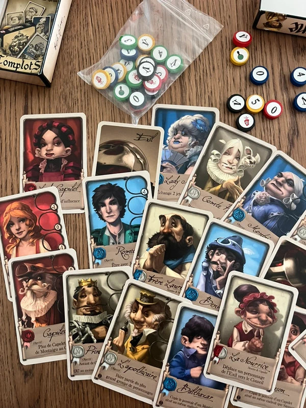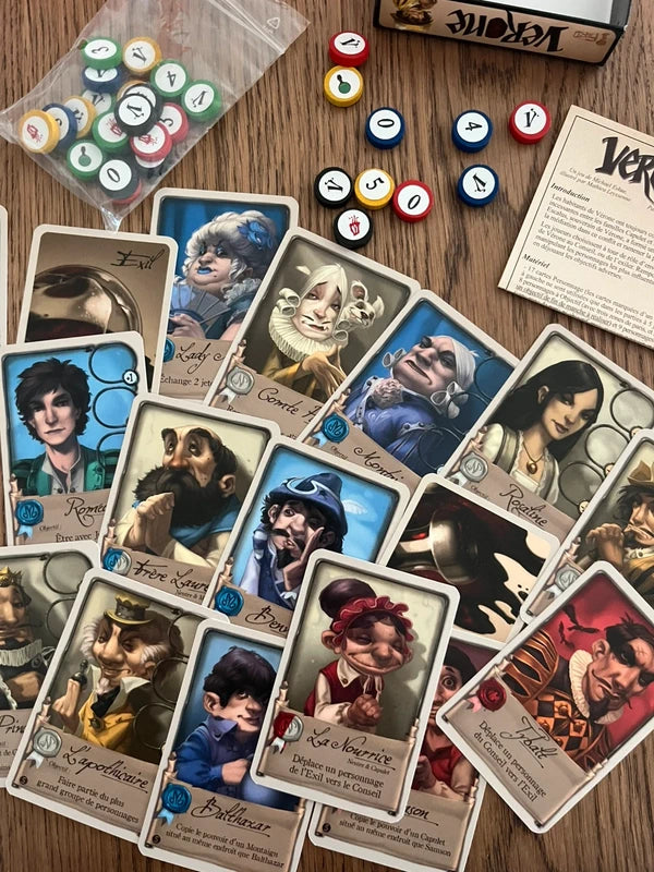 In Vérone, which includes both the Council of Verona base game and the Poison expansion, players take on the role of influential citizens of Verona and act to use their influence to either add characters to the council or cast them into exile. Through thoughtful hand management of their cards and clever placement of influence tokens, players gain victory points based upon the agendas of the characters at the end of the game. The player with the most victory points wins!
