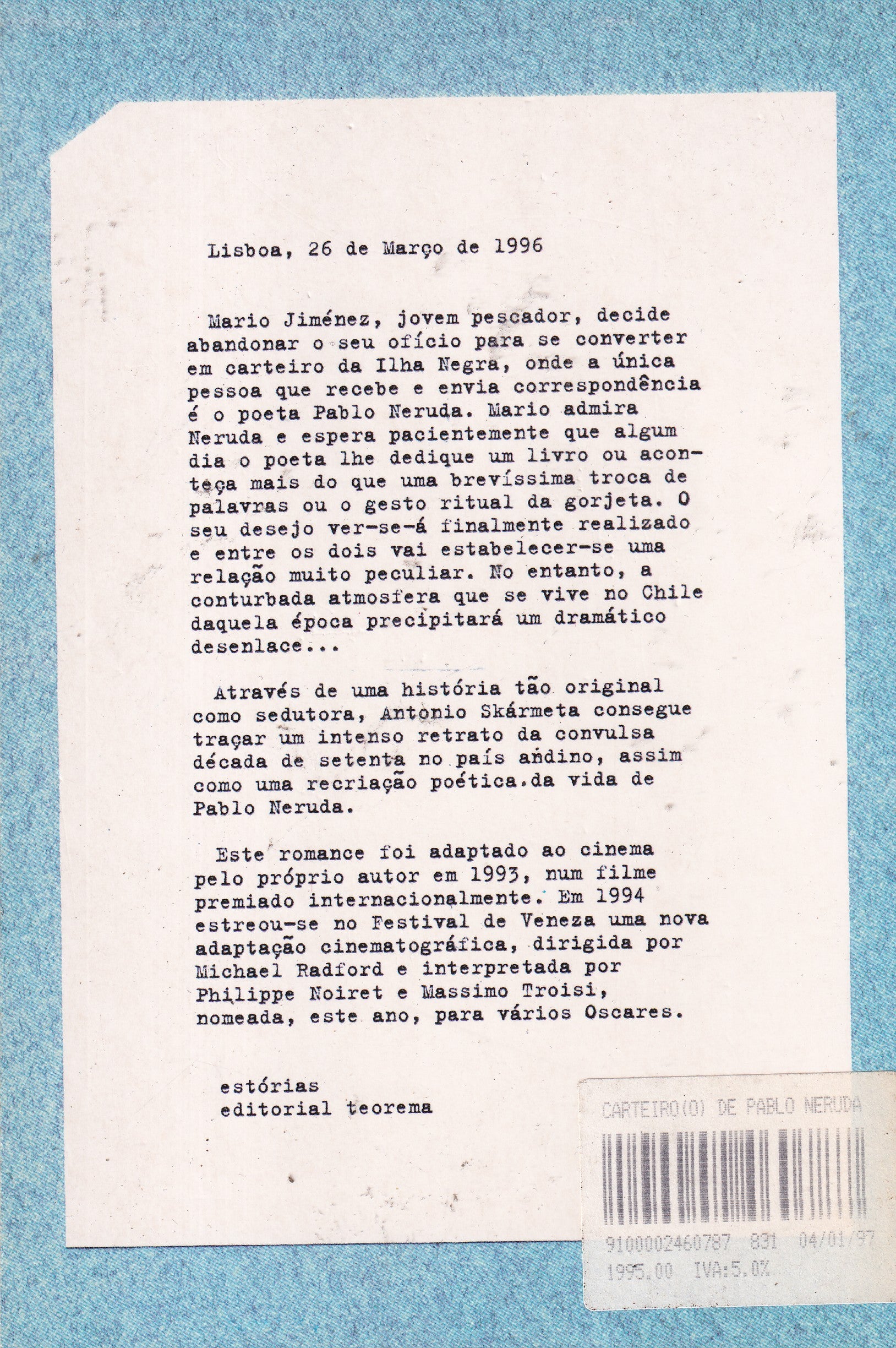 LIVRO O Carteiro de Pablo Neruda de Antonio Skármeta / USADO